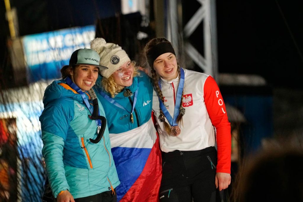 Medal winners in the women’s event (l-r) Ilona Serrer, Aneta Louzecka, Weronika Wieczorek. Credit: Karim Pinter/FINICE