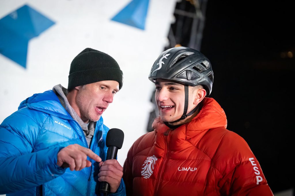 World Tour official commentator Matt Groom and Spain’s Jorge Veiga Rodriguez, World Cup lead gold medal winner in Edmonton. UIAA/Slobodan Mišković